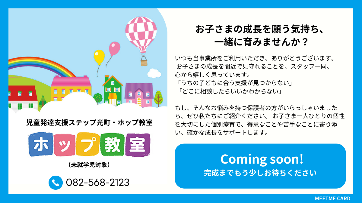 お子様が安心して過ごせる家庭のような環境がここにはあります。ホップ教室では子供たちの特性に寄り添い、できることをどんどん増やしていく、いいところはしっかり伸ばしていくために、一人一人の成長、発達にあった支援をおこないます。